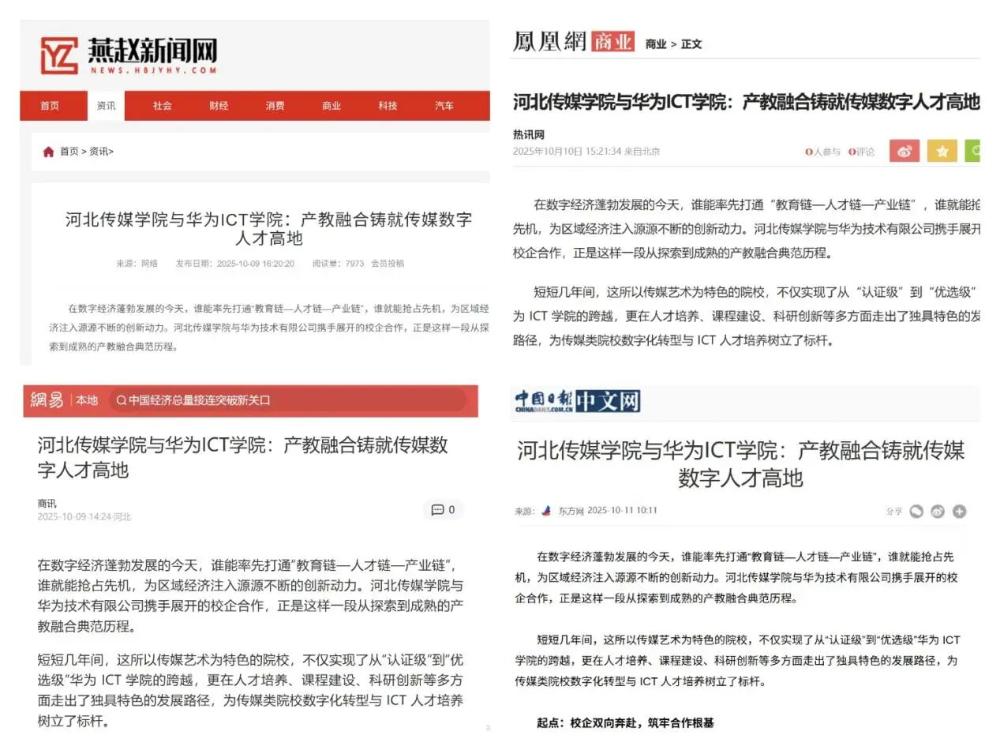 近日,河北传媒学院人工智能学院因与华为公司产教融合成果显著,获中国日报、凤凰网、燕赵新闻网、网易河北等多家主流媒体关注报道。