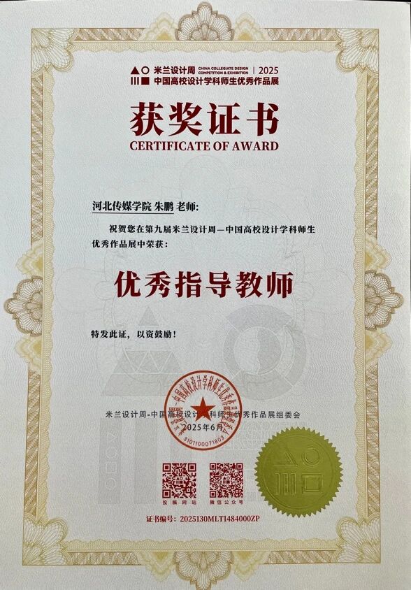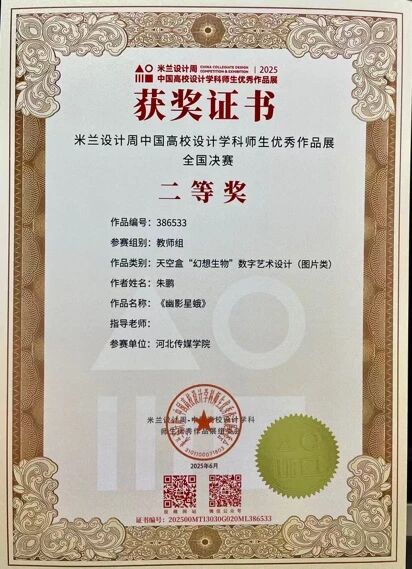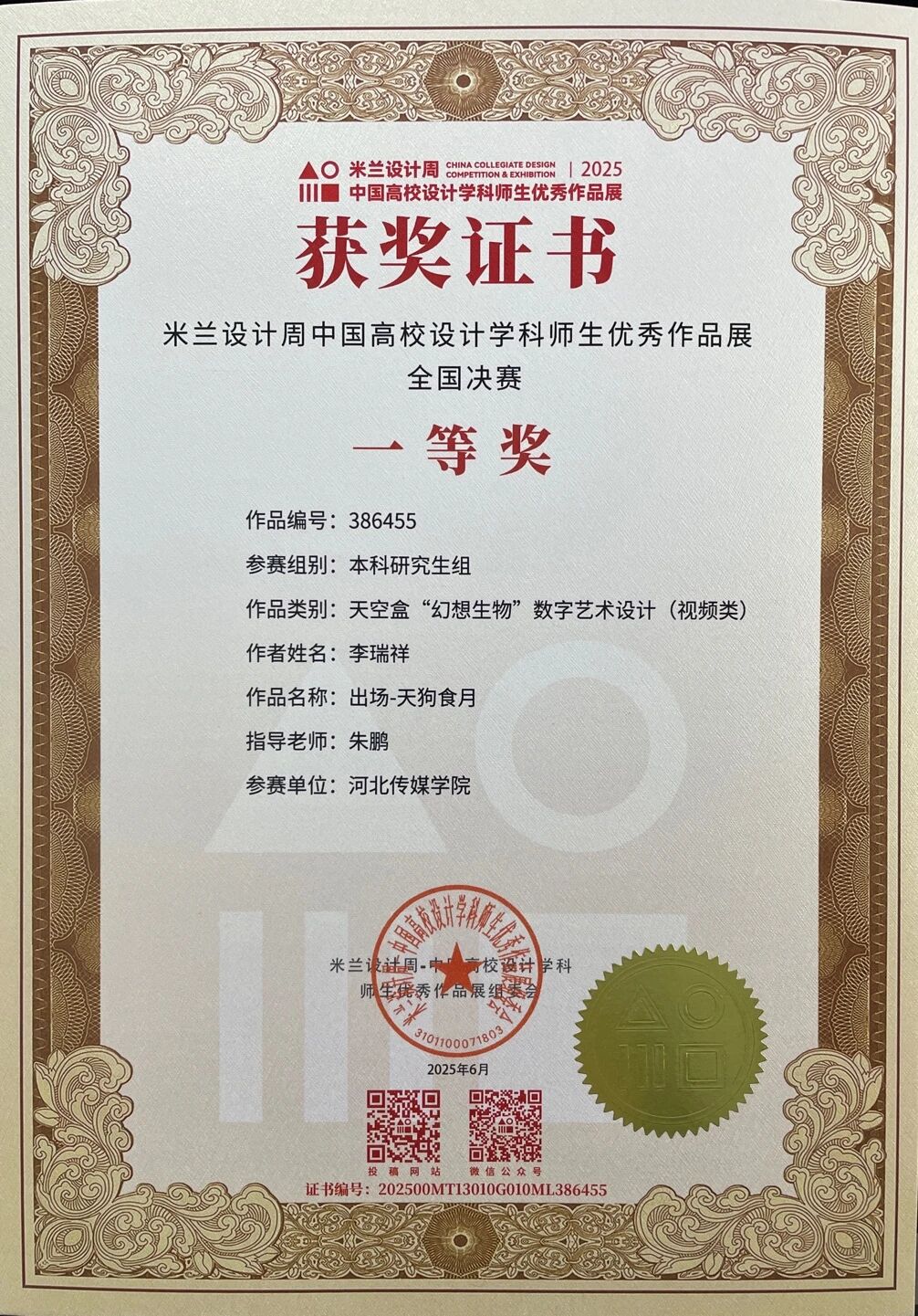 近日,第九届米兰设计周-中国高校设计学科师生优秀作品展全国决赛评选结果揭晓,河北传媒学院数字艺术与动画学院2021级动画专业学生李瑞祥的作品《出场·天狗食月》在“天空盒·幻想生物”数字艺术设计(视频类)项目中荣获本科研究生组一等奖;教师朱鹏的数字艺术设计作品《幽影星蟒》在同主题图片类项目中荣获二等奖,同时,朱鹏在本次赛事中被授予“优秀指导教师”荣誉称号。