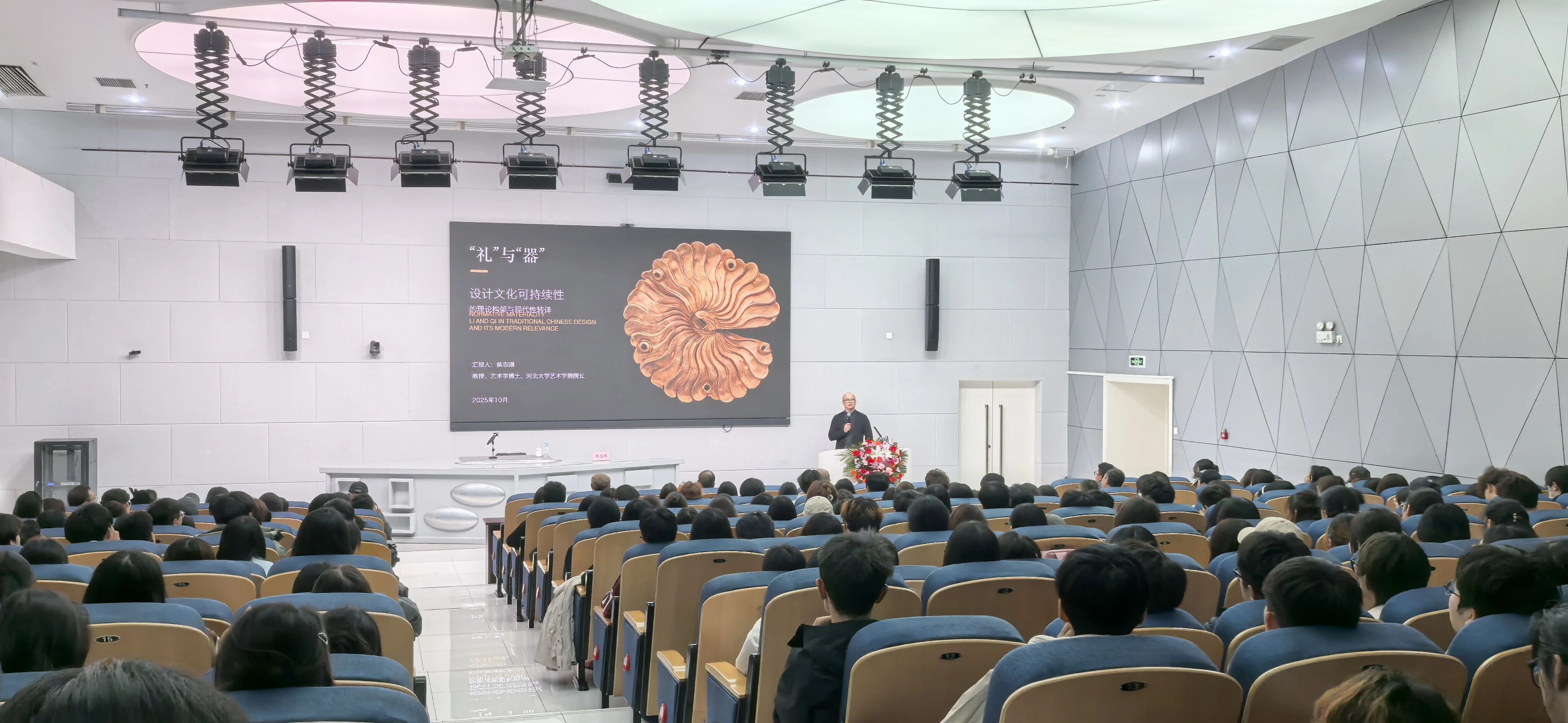 侯志刚院长以“礼—器”一体的设计理论构架为核心,为现场师生带来一场深具启发的思想盛宴。他指出:“设计的本质是将文化的‘秩序与灵魂’通过尺寸、材质转化为可触摸的物质实在。”这一观点将中国传统造物思想与现代设计理念相融合,强调器物不仅是功能的载体,更是文化的具体呈现。在文化现代性转译方面,侯院长提出“三层次转化”理论,即形制延续、功能创新与精神传承,为传统元素在现代设计中的转化提供了系统的方法路径。讲座现场气氛活跃,师生互动频繁,展现出对设计学科发展的持续关注与高度热情。